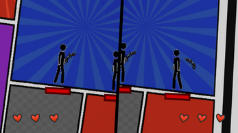 2 players battle in a dynamically generating world of comic strip panels. Weapon sound effects use the verbalized onomatepia of the word instead of playing traditional sound effects.